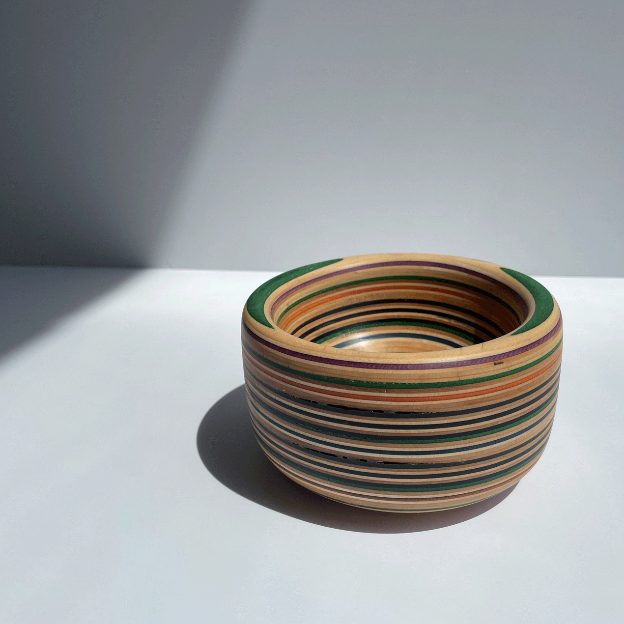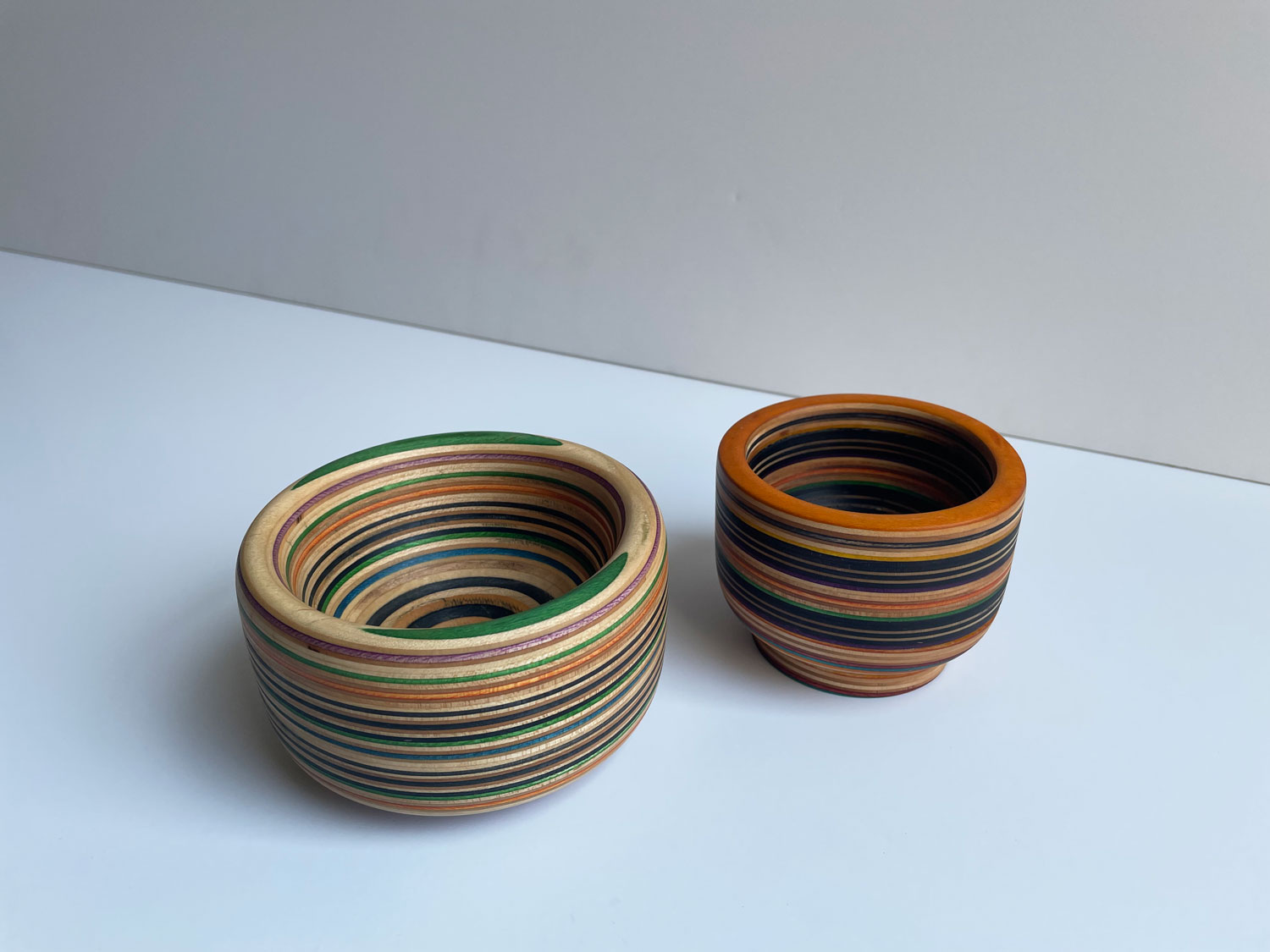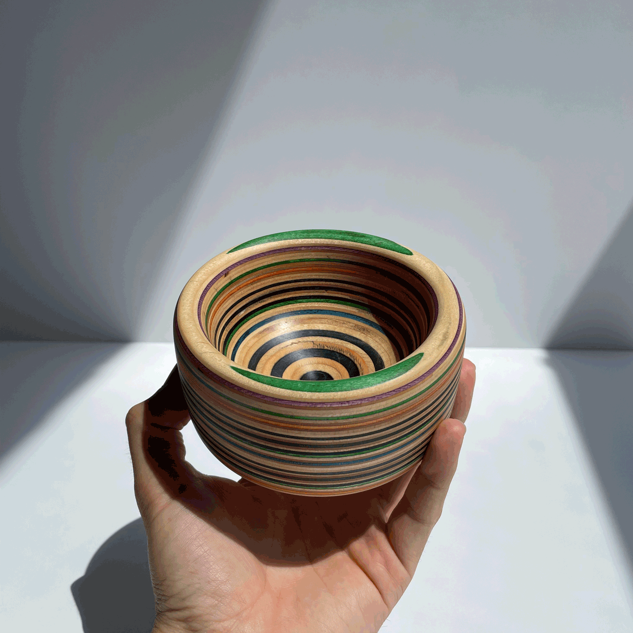 Once the old skateboard decks are processed into workable lumber, I laminate them together and turn them on a lathe. The process of de-gripping the skateboards then removing the residual adhesive and graphic finish is a time consuming process, however the end product is worth the hours of effort. Not only does the process yield beautiful multi-colored pieces of art, but also, reduces the amount of reusable materials ending up in a landfill.